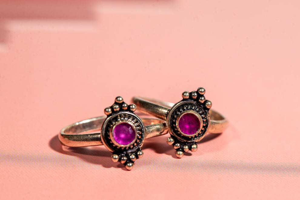 - Oxidised silver toe rings with magenta stone